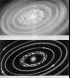 It is necessary that k (=w^2)>0 so that the three types of universes, open, closed, and flat, are a myth. The Ricci tensor components R_{00} and R_{rr} are negatives of one another so that the pressure, as identified from Einstein's field equation is negative! One necessary condition of a nebula is that the pressure be positive throughout. The pressure cannot change sign at any point of the interior, because its vanishing determines the boundary. Its directional derivative normal to the surface also vanishes which means a neutralization of gravitational attraction. Ultimately, the latter becomes outbalanced at which point centrifugal and tidal forces cause a fission of the nebula in which matter is ejected in the form of rings. This Laplace used as a mechanism for the formation of the planets and the sun. Actually, he added mathematical substance to an earlier idea of Kant, but that's how progress is made. The rings which separated from the main body of the nebula condensed into planets and their satellites with the remainder forming the sun. (see images below).